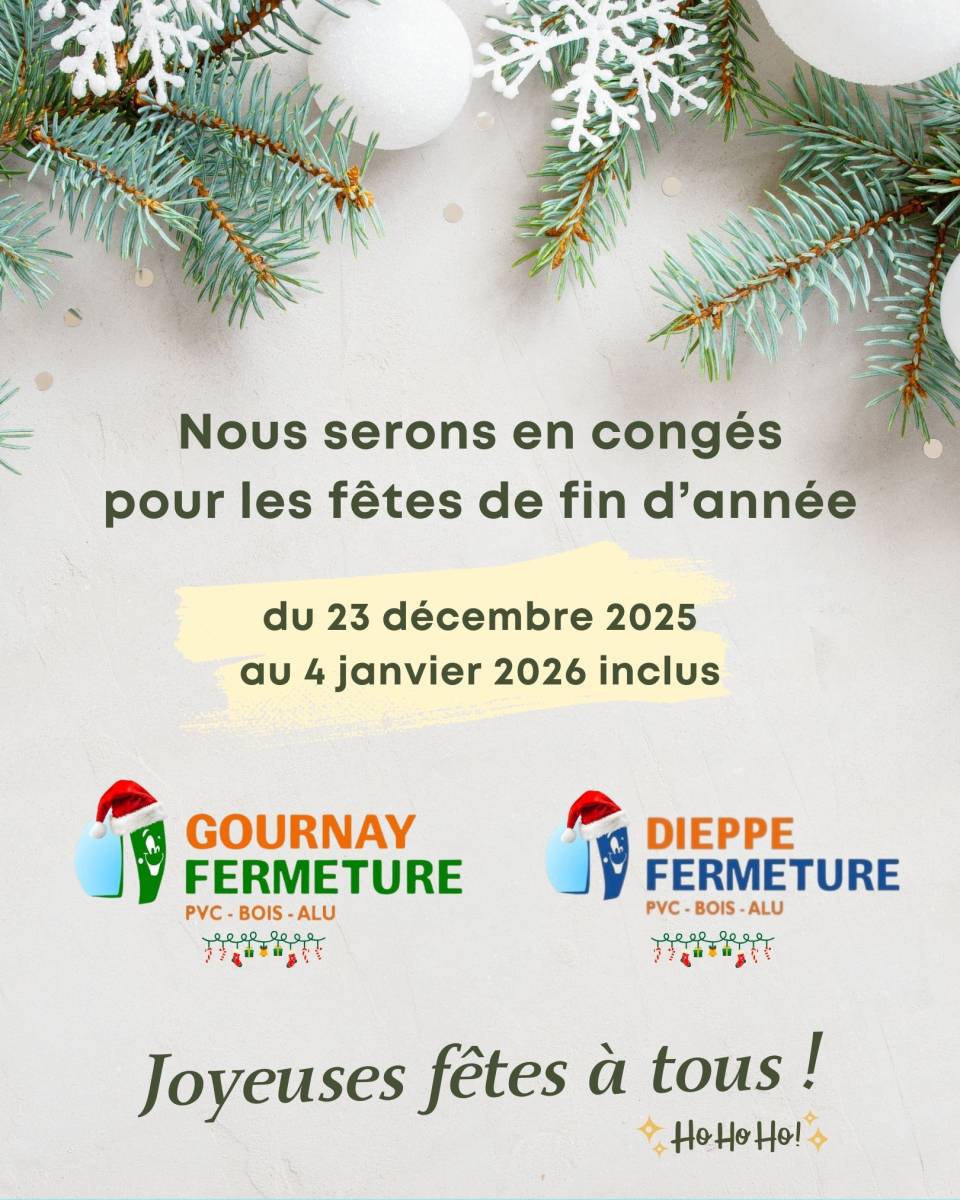 Nos agences Gournay Fermeture et Dieppe Fermeture feront une pause du 23 décembre au 4 inclus janvier 2026.