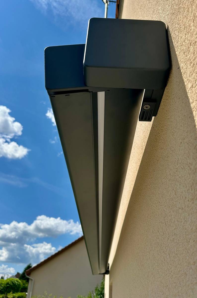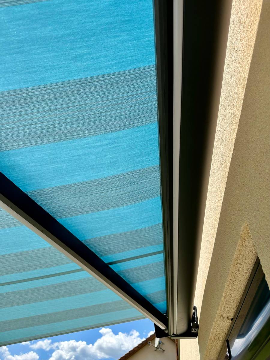 Ce modèle, que nous installons sur mesure, offre une protection efficace sans alourdir la façade. Sa toile bleu Pencil (Dickson) et sa structure gris anthracite lui donnent une allure sobre et actuelle, qui s’intègre facilement à tous types d’habitations, du pavillon au logement de ville. Et pour prolonger vos soirées d’été, vous pouvez opter pour un éclairage LED intégré (en option), directement dans les bras ou le coffre.