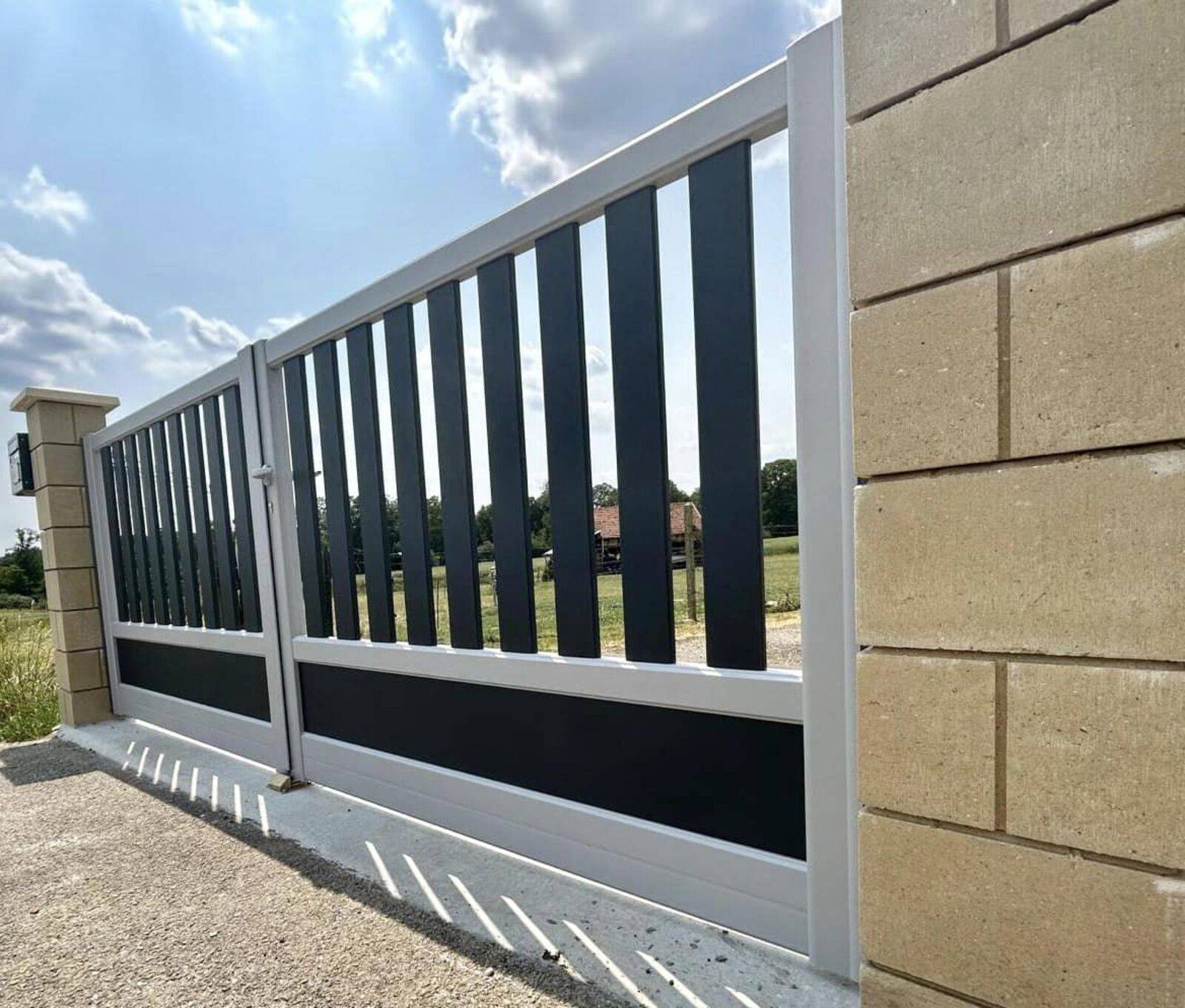 Le portail installé se distingue par sa forme droite, offrant une ligne épurée qui s'intègre harmonieusement dans l'architecture de la maison. La bi coloration choisie par le client apporte une touche de modernité : le Gris RAL 9006 STC 2 s'associe élégamment au Gris RAL 7016, créant un contraste subtil qui rehausse l'apparence de la propriété.
