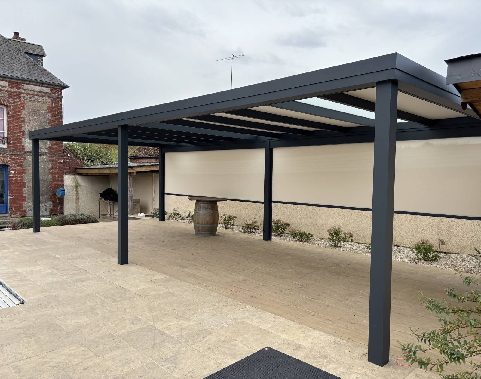 À Gournay-en-Bray, offrez à votre extérieur un véritable espace de vie avec une pergola en aluminium réalisée sur mesure. Le RAL 7016 gris anthracite, une teinte moderne et élégante, transforme votre terrasse en un lieu à la fois esthétique et pratique. Avec l'ajout de stores motorisés et d'un vitrage de toiture, vous pourrez profiter pleinement de votre espace extérieur tout au long de l’année.