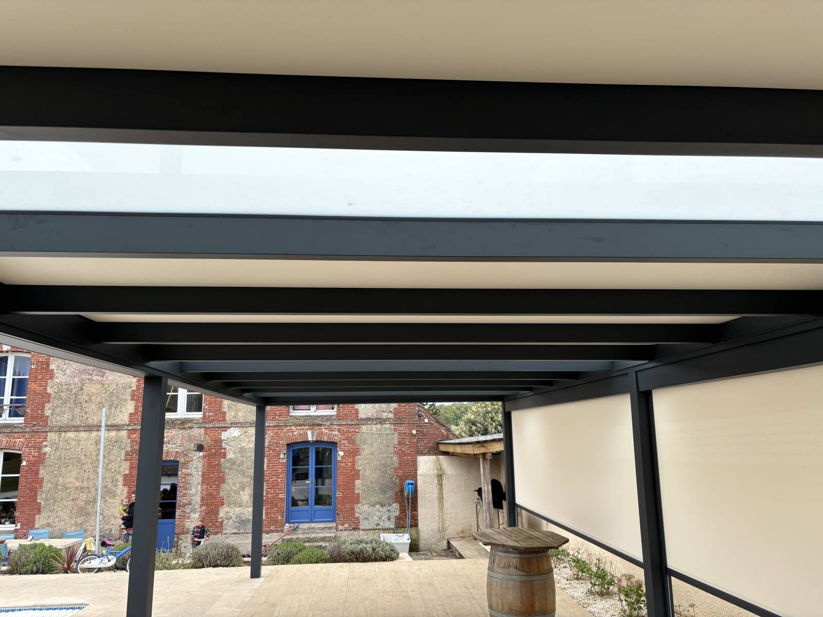 Proche de Gournay-en-Bray, cette pergola est conçue pour résister aux intempéries tout en étant parfaitement intégrée à votre environnement. La structure en aluminium thermolaqué assure une robustesse à toute épreuve, et sa finition en RAL 7016 gris anthracite confère à votre espace un style contemporain. Les stores motorisés sont l’élément idéal pour réguler la lumière et la chaleur selon vos envies. De plus, le vitrage de toiture permet de capter un maximum de lumière naturelle tout en étant légèrement teinté pour limiter les excès de chaleur en été.
