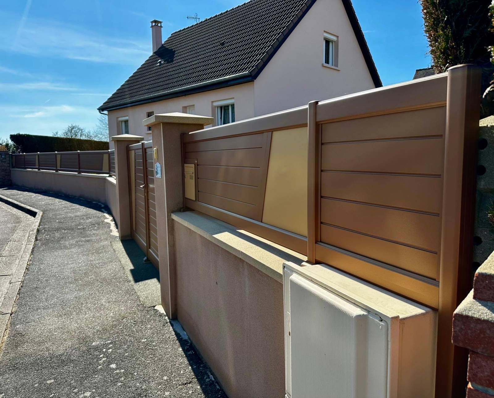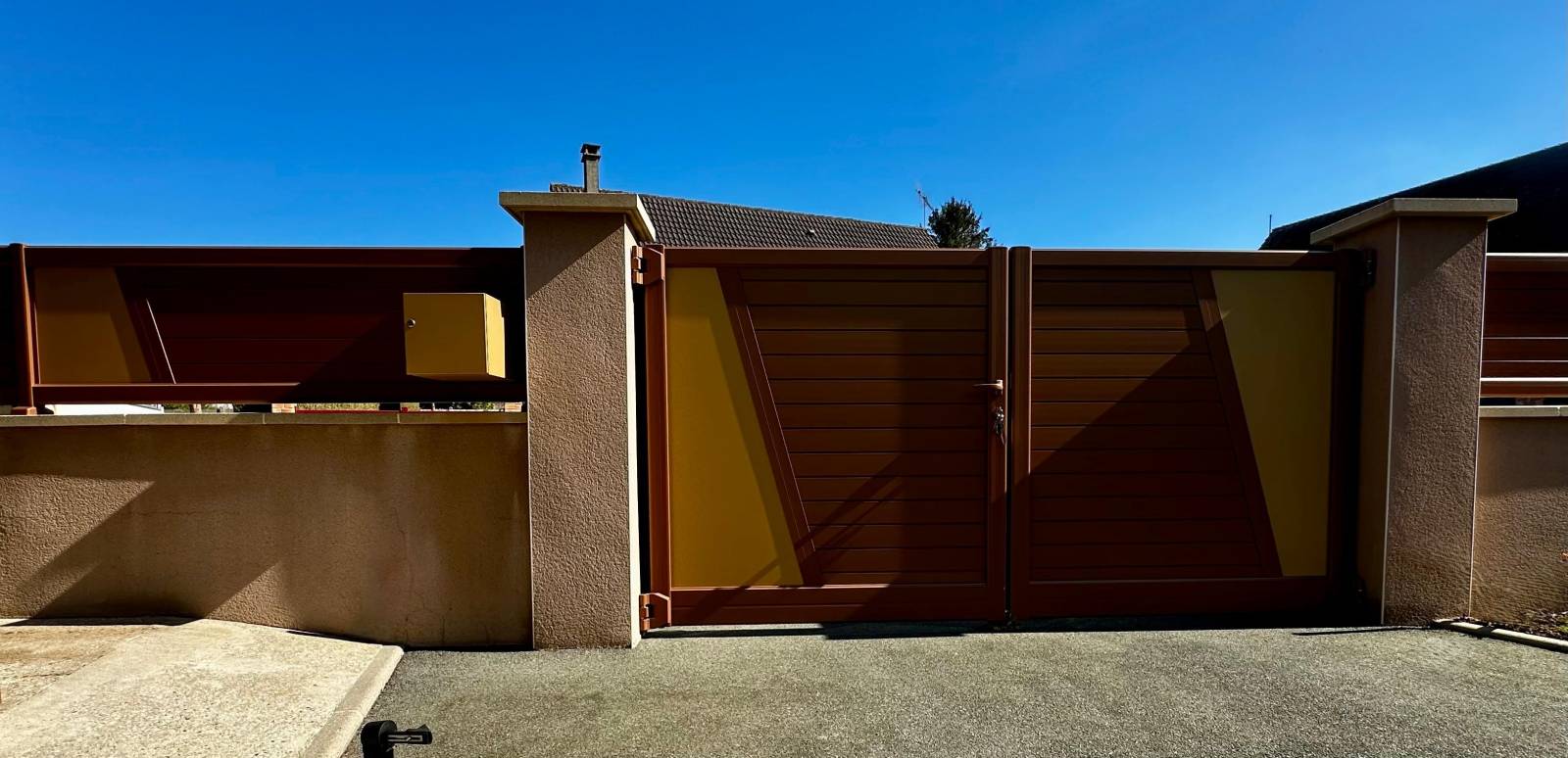 Le portail à deux vantaux et la clôture associent deux coloris distincts : Ordos pour la structure principale et Ambre pour les panneaux lisses.