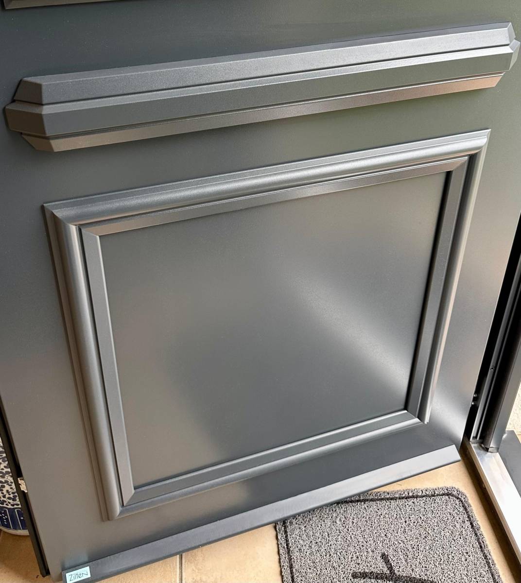 Le modèle installé présente une couleur grise RAL 7016 appliquée sur les deux faces, en harmonie avec les volets existants. Les moulures symétriques, les décors sérigraphiés gris foncé et la poignée ton inox avec cache-fiches assortis soulignent l’attention portée aux détails décoratifs. L’ensemble donne à la façade une allure élégante et contemporaine, fidèle aux attentes de notre cliente.