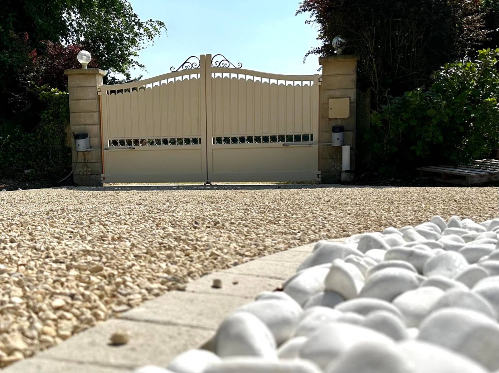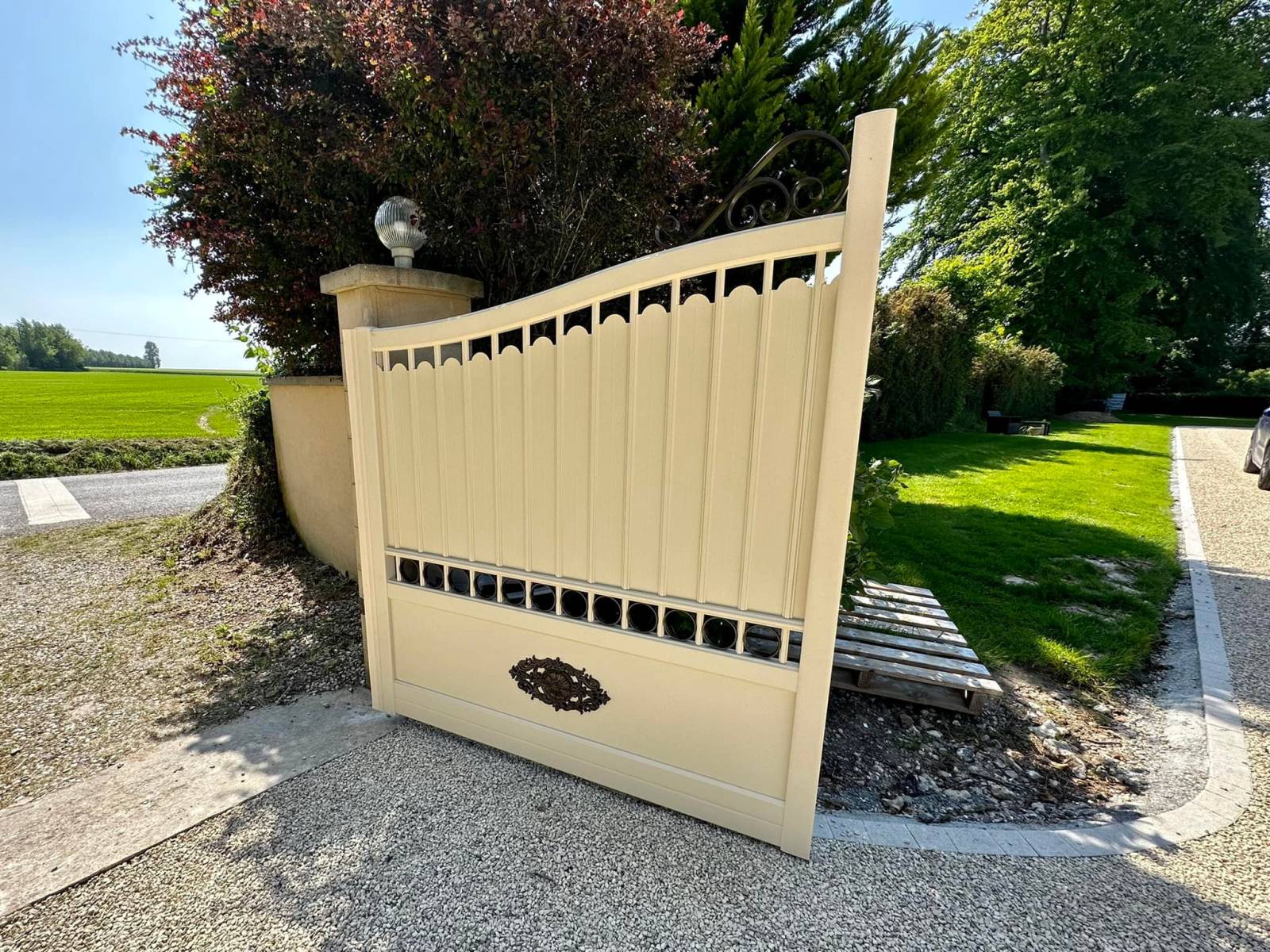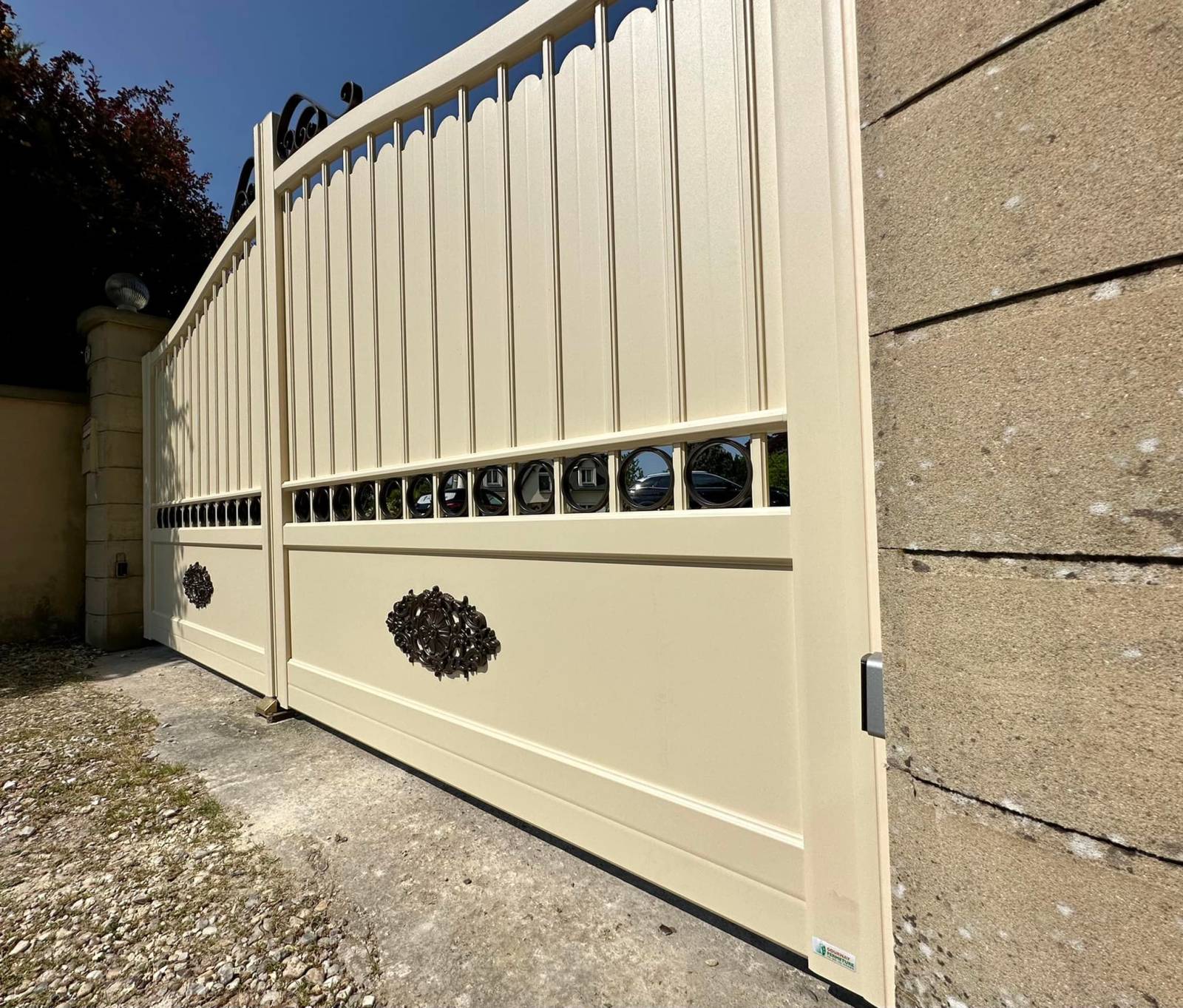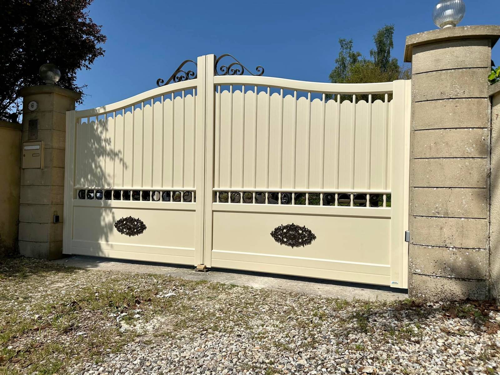 Le portail, avec ses lignes traditionnelles rappelant le fer forgé, s’intègre parfaitement à l’architecture de la maison tout en apportant une touche d’authenticité. Fabriqué en matériaux durables, et laqué avec un procédé très contrôlé, nous sommes en mesure aujourd’hui de vous garantir votre portail pendant 20 ans, structure et laquage !