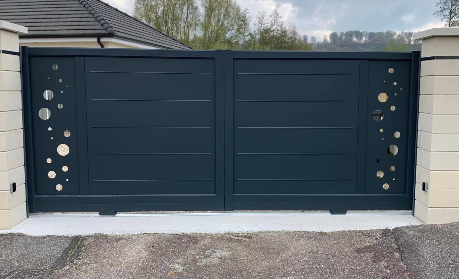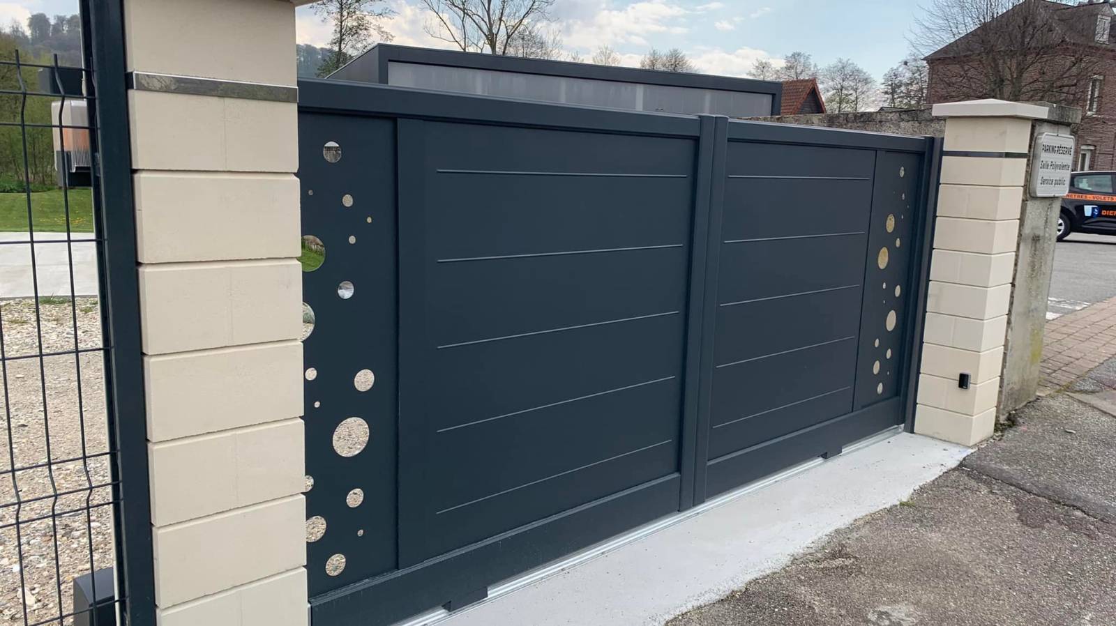 Portail coulissant de la gamme TENDANCE, avec décors sur une épaisse tôle d’aluminium découpé au laser. Le coloris gris anthracite RAL 7016 Structuré avec un thermo laquage classe 2 ! Labellisé Qualimarine !